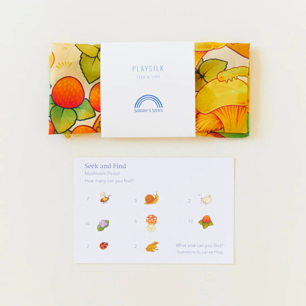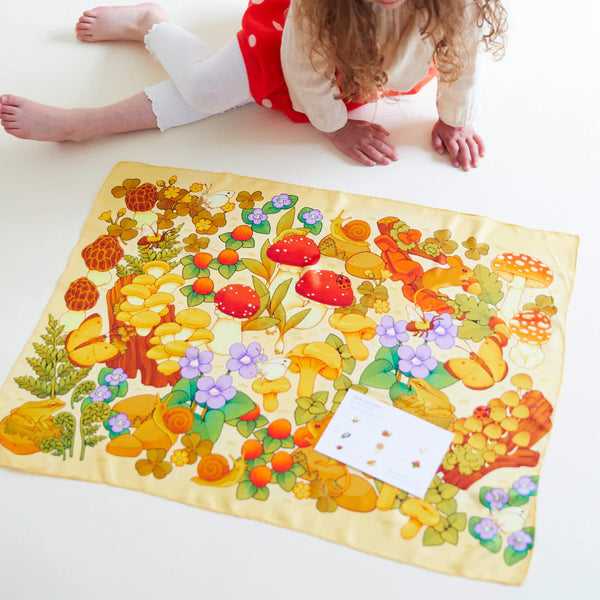 Inkludert med silken er et unikt kort med forslag til barnet for enkelt å begynne å søke og finne sopp, insekter og mer! Perfekt for rolige stunder for seg selv, og et herlig leketøy å ha med på turer.