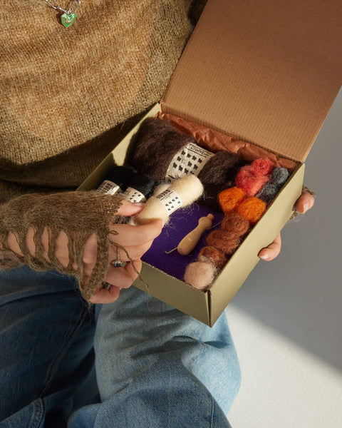 Inneholder 9 farger Bheda-filteull, 2 tovingåler, en økologisk skumpute, en treholder til tovingåler, svarte øyne, piperensere som kan pakkes rundt og tydelige instruksjoner med video.